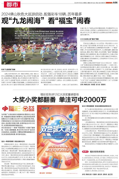 为回馈广大购彩者对中国福利彩票的关心和支持,中国福利彩票发行管理中心决定自双色球游戏第2024126期(2024年11月3日晚开奖)开始,开展总奖金为12亿元的2024年双色球游戏派奖活动。