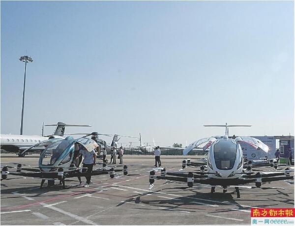 停机坪上展示的亿航智能载人航空器EH216-S及EH216-F。 南方日报记者 张令 摄
