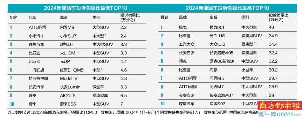 在2024新能源车投诉率Top50报告中,我们梳理了不同品牌不同车型的投诉数据,为体现对比公平性,按照“投诉销量比”作出排序。