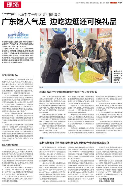 第七届中国国际进口博览会(简称“进博会”)如期而至,广东也连续七年在进博会展馆城市会客厅展区搭建广东人文交流馆。
