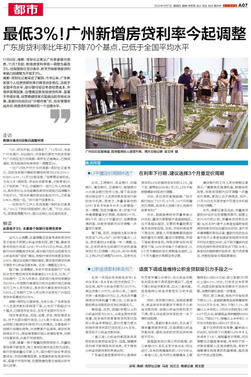 11月6日,南都·湾财社记者从广州多家银行获悉,11月7日起,新增房贷利率统一调整为最低3%。