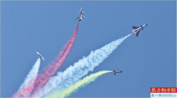 昨日上午,空军“八一”飞行表演队开始了第十五届中国航展的首次适应性训练。有着中国“蓝天仪仗队”美誉的空军“八一”飞行表演队,在珠海上空惊艳出场,拉出彩烟,为观众带来了一场精彩的视觉盛宴。