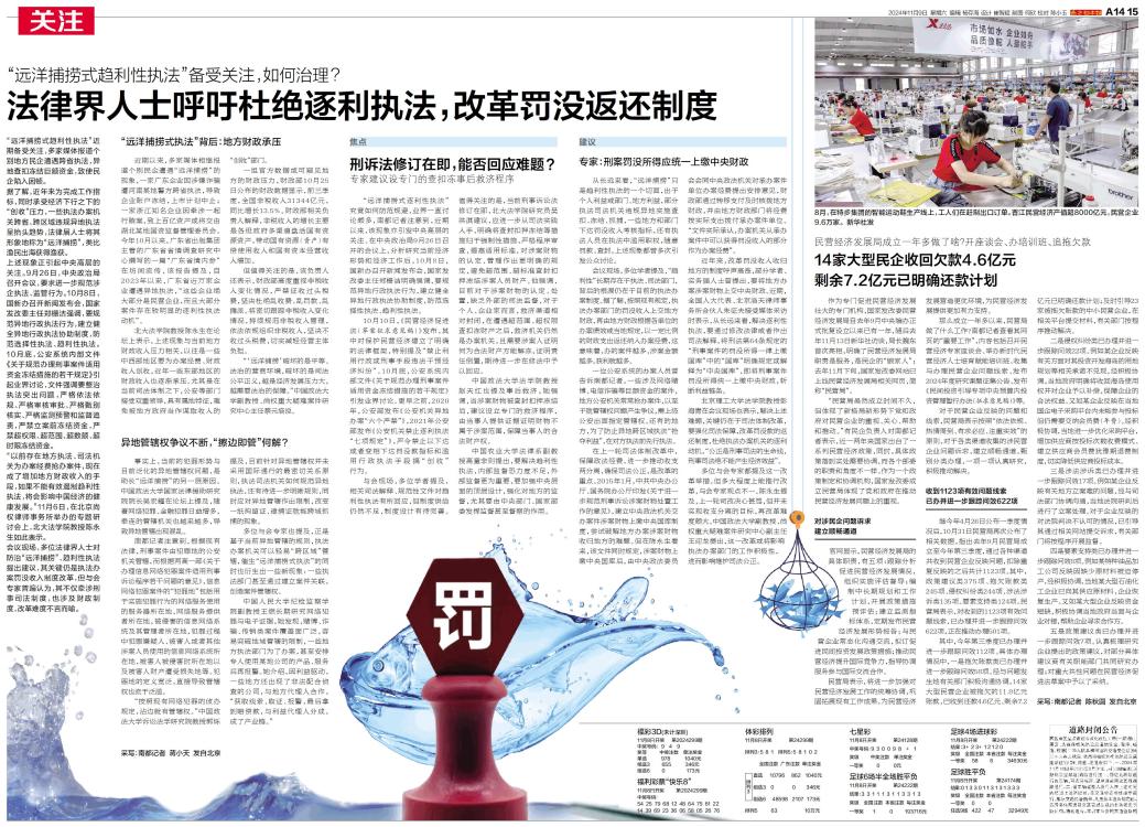 近期以来,多家媒体相继报道个别民企遭遇“远洋捕捞”的现象,一家广东企业因涉嫌诈骗遭河南某地警方跨省执法,导致企业账户冻结,上市计划中止;一家浙江知名企业因牵涉一起行贿案,致上百亿资产或将交由湖北某地国资监督管理委员会。今年10月以来,广东省出版集团主管的广东省省情调查研究中心撰写的一篇“广东省情内参”在坊间流传,该报告提及,自2023年以来,广东省近万家企业遭遇异地执法,“这些企业绝大部分是民营企业,而且大部分案件存在较明显的逐利性执法动机”。
