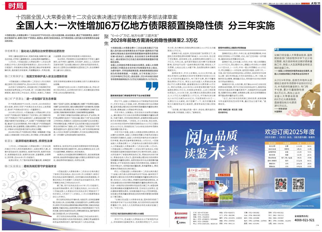全国人大:一次性增加6万亿地方债限额置换隐性债 分三年实施