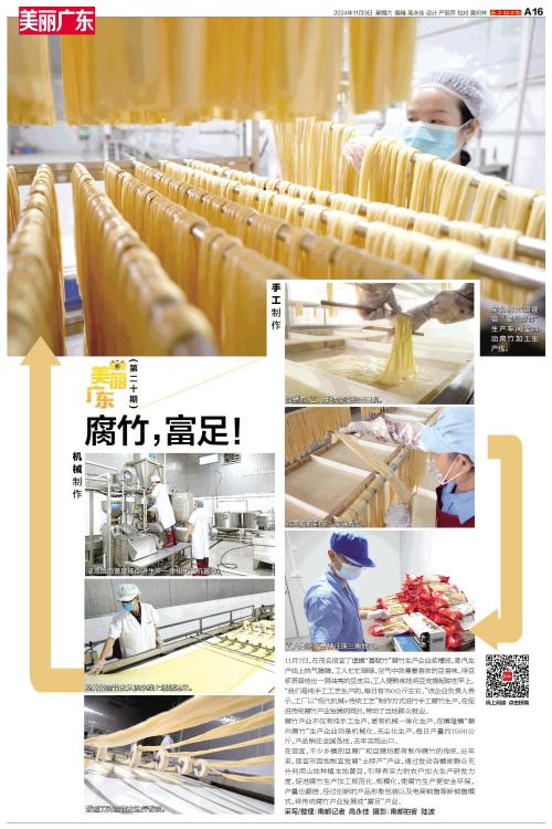 11月7日,在茂名信宜丁堡镇“喜赋竹”腐竹生产企业浆槽间,蒸汽生产线上热气腾腾,工人忙忙碌碌,空气中弥漫着香浓的豆香味。