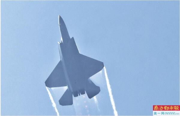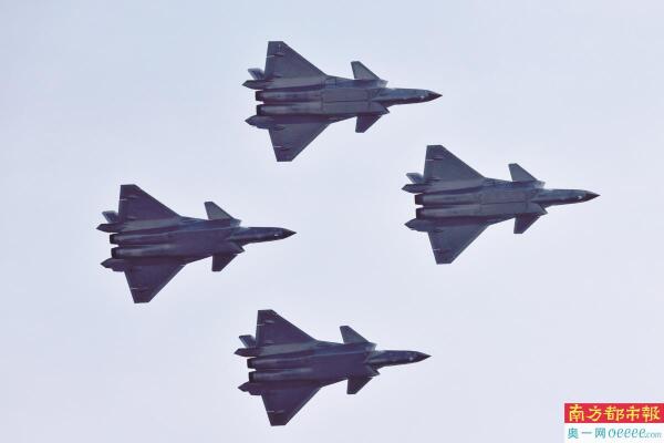 中国空军驾驶歼-20战机四机编队献上特技飞行表演。