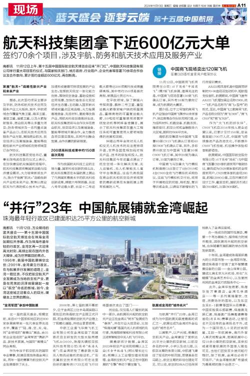 南都讯 11月12日上午,第十五届中国国际航空航天博览会迎来“开门红”。中国航天科技集团有限公司举行重大项目签约仪式,与国家相关部门、地方政府、行业用户、企业代表等签署70余项合作协议及合作意向,累计签约金额近600亿元,再创新高。