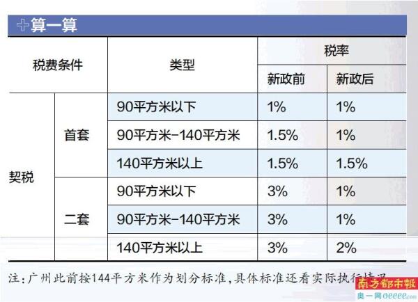 在这次新政之前,广州首套房小于90平方米,按1%征契税,大于等于90平方米,按1.5%征契税,二套或者以上不管多大面积,都按3%征契税。如今在新政后,购买家庭唯一及第二套住房不超140平米,都按1%缴纳契税;超过140平米,税率则为1.5%-2%,最大的减税幅度有望达到减少2/3。