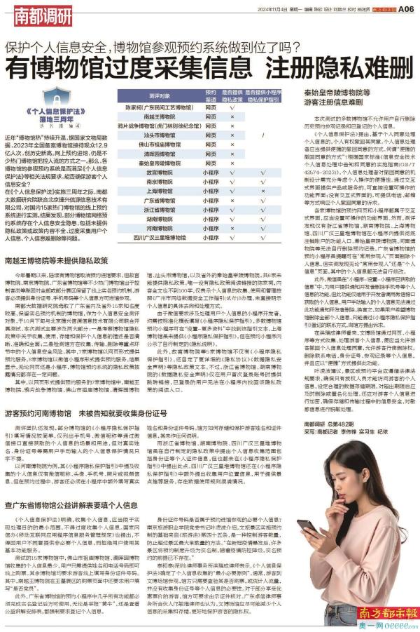 近日,南都对国内15家热门博物馆的线上预约系统进行个人信息安全测试,推出报道《过度采集、隐私难删……保护个人信息安全,博物馆到位了吗?》。针对报道提及问题,陈家祠(广东民间工艺博物馆)相关负责人回应表示,该馆正在完善新版隐私政策,预计近期对外公示;浙江省博物馆回应称游客信息授权默认一天有效。但部分博物馆对相关问题持回避态度,未解释其个人信息处理规则。