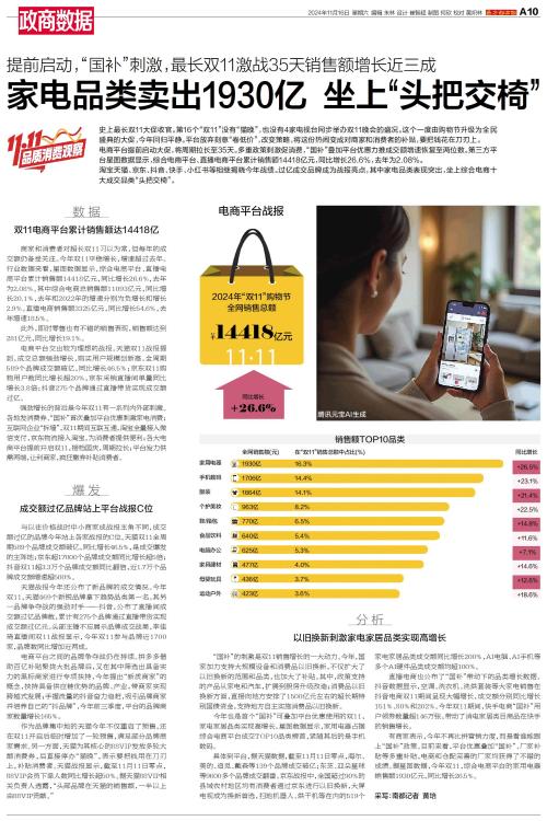 有商家表示,今年不再比拼营销力度,而是看谁能跟上“国补”政策。目前来看,平台优惠叠加“国补”、厂家补贴等多重补贴,电商和仓配完善的厂家均获得了不错的成绩。据星图数据,今年双11,综合电商平台的家用电器销售额1930亿元,同比增长26.5%。