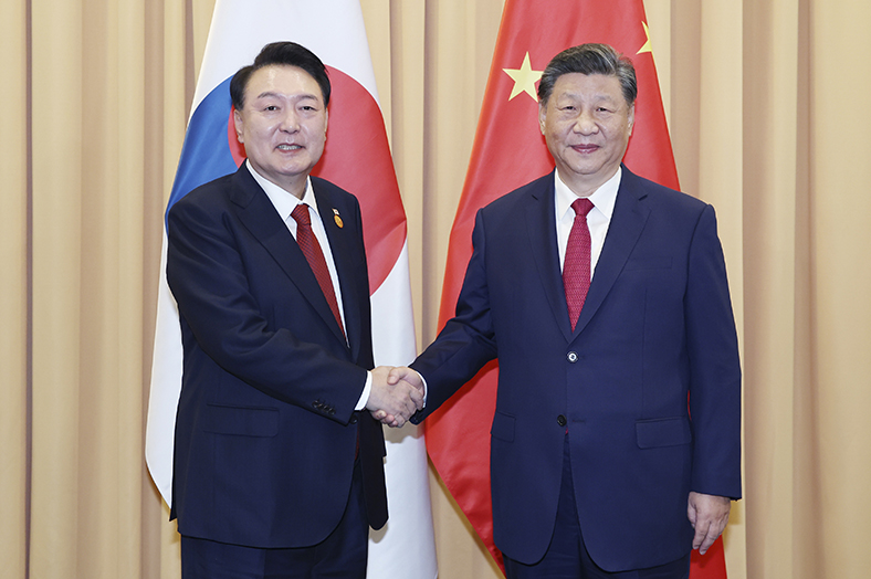 习近平强调,双方应该加强高层交往,增进理解信任,致力于相互成就,实现共同发展。中国坚定不移扩大高水平对外开放,欢迎更多韩国企业来华投资兴业。双方要共同致力于维护国际自由贸易体系,维护全球及地区产业链供应链稳定畅通,多开展有利于增进友好的活动,鼓励舆论界、学术界、地方特别是青年人加强往来。欢迎更多韩国民众来华,希望韩方为中国公民赴韩推出更多便利化措施。中方祝贺并支持韩国接任明年亚太经合组织东道主,愿同韩方扩大多边协调和合作。