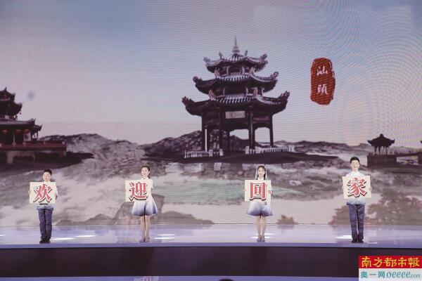 开幕活动现场,小朋友手持“欢迎回家”字帖表演节目。