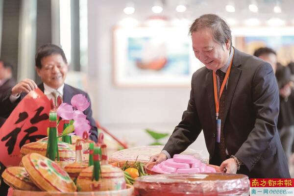 进入汕头国际会展中心后,带着露珠的荷花迎门绽放,红色的八仙桌上摆放着潮汕传统的春盛、粿箶、茶炉,还有五种水果、束砂等“茶配”,这一场景充满潮汕传统民居元素,吸引了众多归乡的潮人在此驻足拍照打卡。此外,像丝绸针画、潮汕的剪纸作品,还有澄海玩具,以及大型的木雕作品《潮汕揽胜》,都分别向来宾呈现了汕头的文化特色以及产业发展态势。