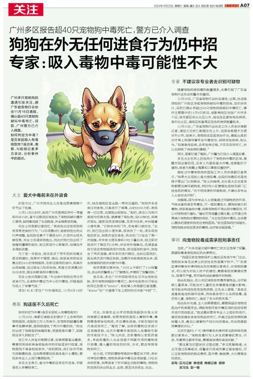 广州多只宠物狗的遭遇引发关注。据广东省宠物行业协会11月16日通报,确认超40只宠物狗疑似中毒死亡。目前,广州警方已介入调查。