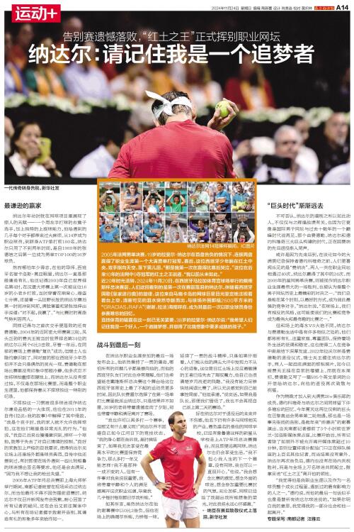 近20年时光流转,2024年11月20日,在西班牙马拉加体育宫球场举行的戴维斯杯总决赛前,人们这回看到的是第一次在赛前落泪的纳达尔。伴随着西班牙国歌《皇家进行曲》的旋律,这位来自马略卡岛的网球巨星目光坚定地注视着看台上空,清晰可见的泪水突然夺眶而出,与球场外围那幅2600平方米的“GRACIAS,RAFA”(谢谢,拉法)海报呼应,成为其最后一次以职业球员身份参赛难忘的回忆。