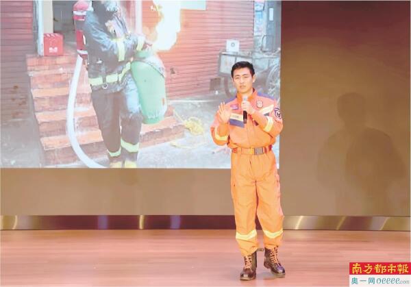 消防员登上广州赛区舞台,讲述亲身经历。 广东省见义勇为基金会供图