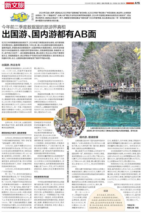 在2023年同期基数较高的情况下,2024年前三季度的旅游业表现,或可客观窥见年度的变化。南都梳理数据发现,今年以来,国人在出国游及国内游的选择中,谨慎而雀跃。