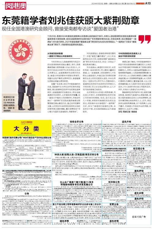 11月23日,香港2024年度勋衔颁授典礼在香港礼宾府宴会厅举行,共有5人获颁香港特区授勋及嘉奖制度最高荣誉大紫荆勋章,现任全国港澳研究会顾问的广东东莞籍学者刘兆佳,亦获此殊荣。