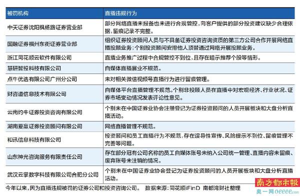 南都湾财社记者根据同花顺iFinD数据梳理发现,今年以来,至少有11家证券公司和投资咨询机构因为网络直播不合规被罚,其中有9家为投资咨询机构,即第三方投顾机构,被罚原因包括安排非持证人员对大盘等进行分析评论、暗示推荐个股、直播未留痕等。处罚力度上,有投顾机构被责令暂停新增客户半年。