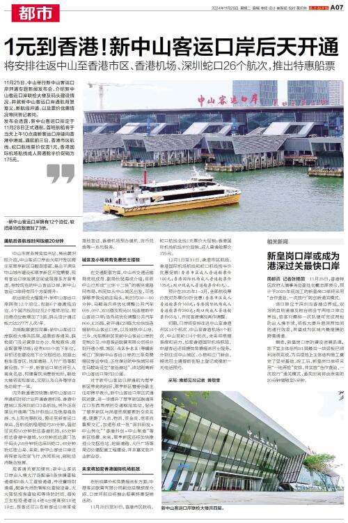 11月25日,中山举行新中山客运口岸开通专题新闻发布会,介绍新中山客运口岸联检大楼及码头建设情况,并就新中山客运口岸通航背景意义、新航线开通,以及票价优惠情况等回答记者问。