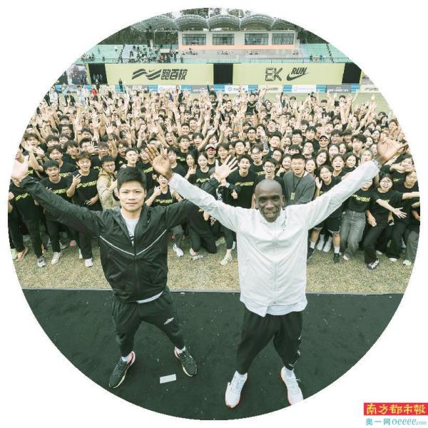基普乔格是在访问了北京后飞抵广州的。到广州的第二天,这位两届奥运会男子马拉松金牌得主便出现在了暨南大学石牌校区田径场,在那里迎接他的是东道主、亚洲飞人苏炳添。