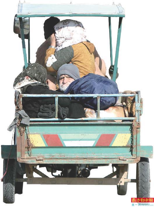 2024年12月3日,在叙利亚哈马省北部城镇苏兰,叙利亚人乘坐三轮车逃离这一战乱地区。