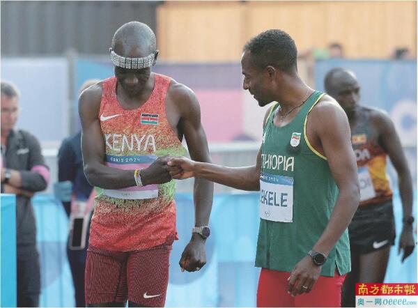 在今夏巴黎奥运会上,现役两位跑得最快的马拉松选手基普乔格(左)与贝克勒同台竞技。 IC图片
