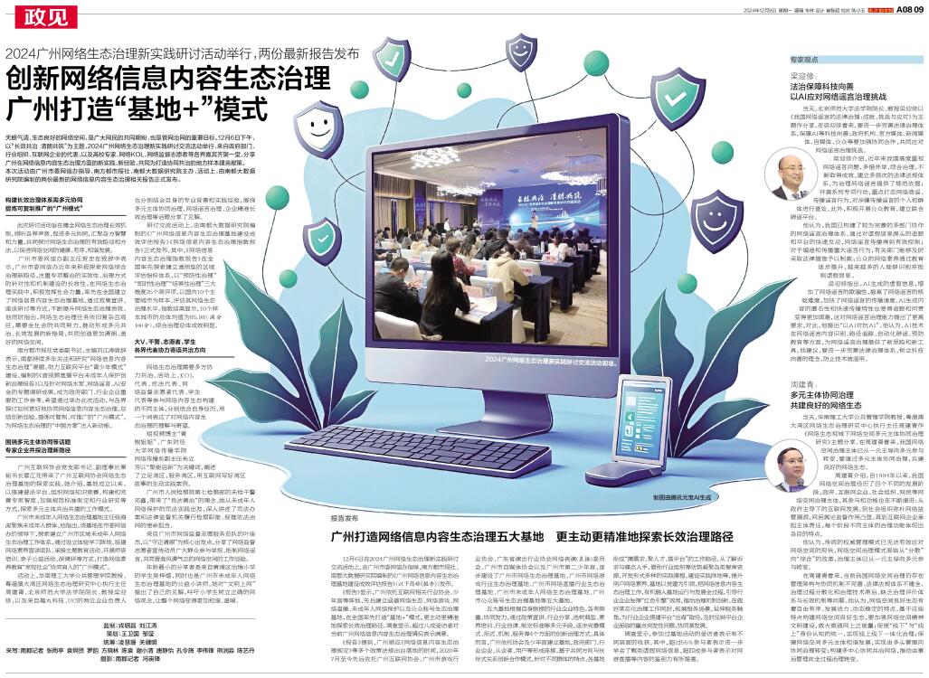 12月6日下午,以“长效共治 清朗共筑”为主题,2024广州网络生态治理新实践研讨交流活动举行。