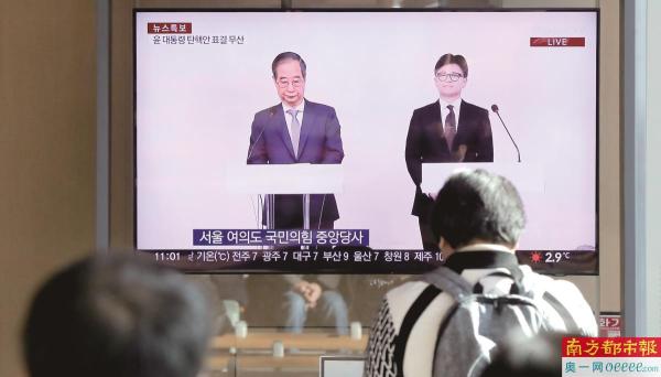 12月8日,韩国民众观看执政党代表韩东勋与总理韩德洙(左)会见记者的电视直播。