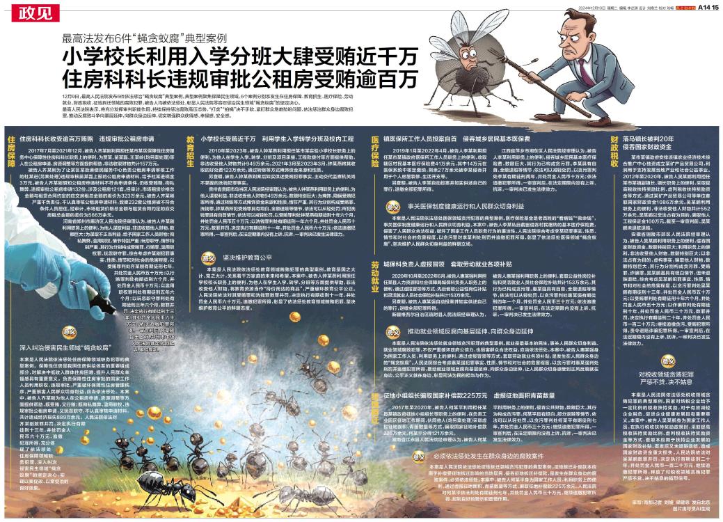 12月9日,最高人民法院发布6件依法惩治“蝇贪蚁腐”典型案例。