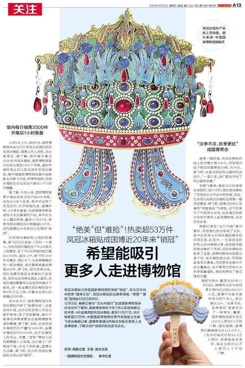 在社交平台中检索“国博文创”,凤冠冰箱贴的出镜率很高,“绝美”“难抢”是网友们对它的评价。