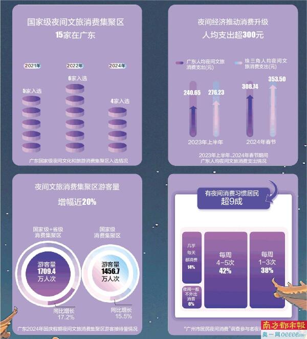 作为城市活力的新标志,夜间经济正成为拉动消费的新引擎之一。近日,2024中国夜间经济研究成果发布活动在深圳市福田区举办。据业内预测,2024年国内夜间旅游总花费将达到1.91万亿元,较去年同比增长21.7%。广东在夜间经济方面有何亮眼表现?南都大数据研究院带你一起数看广东新“夜”态。