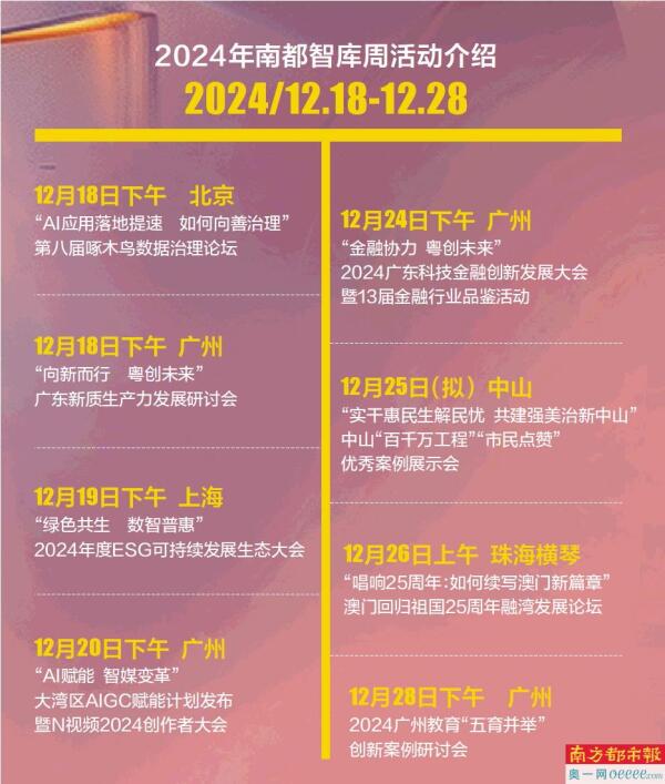 高质量发展、新质生产力、人工智能+……在2024年一次次与我们交集。紧扣时代之需,2024年南都智库周以“数启新篇 智绘未来”为主题,12月18日至28日,将陆续在北京、广州、上海、中山、珠海多地带来8场思维盛宴,围绕“AI赋能”“新质生产力调研”“科技金融创新”“新时代澳门故事”等集中发布南都智媒成果。