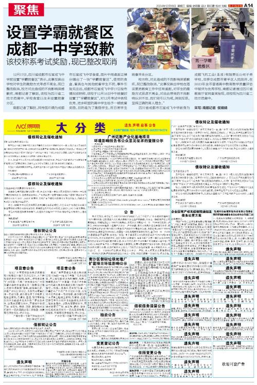12月17日,四川省成都市石室成飞中学就设置“学霸就餐区”表示,此事反映出学校对学生的激励方式考虑不周全,现已整改取消,校方对此造成的不良影响深感歉疚。