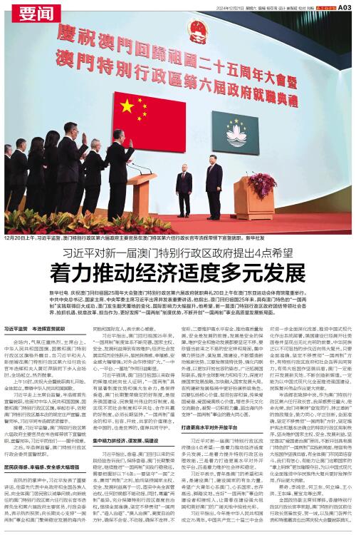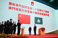 庆祝澳门回归祖国25周年大会暨澳门特别行政区第六届政府就职典礼20日上午在澳门东亚运动会体育馆隆重举行。