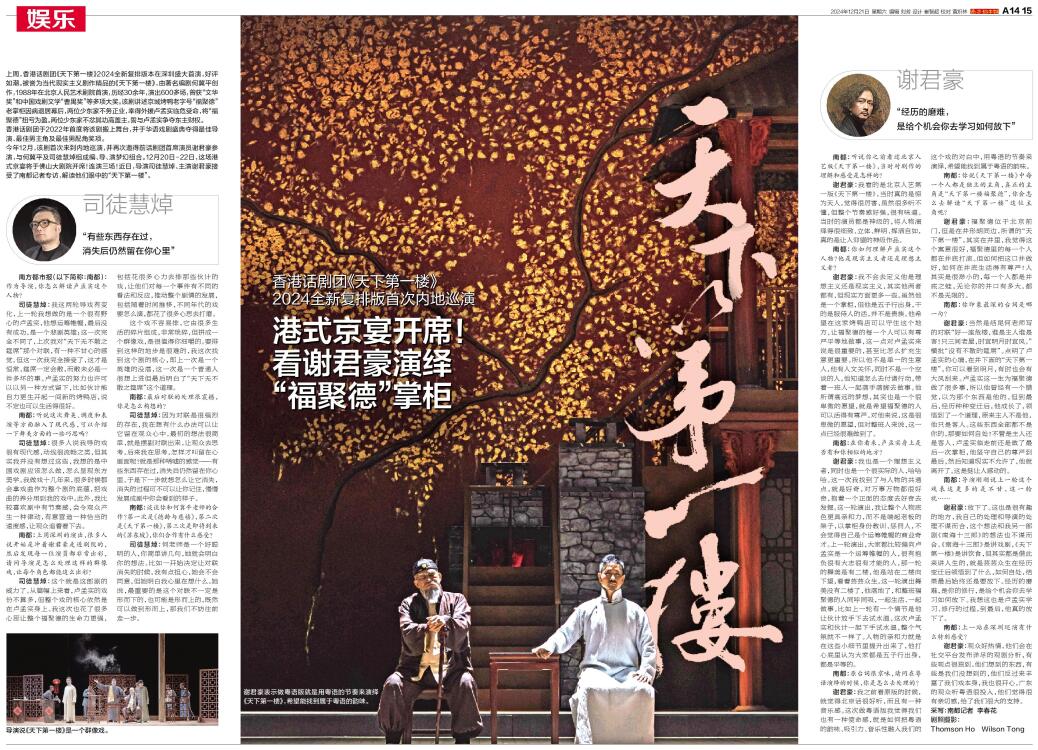 上周,香港话剧团《天下第一楼》2024全新复排版本在深圳盛大首演,好评如潮。