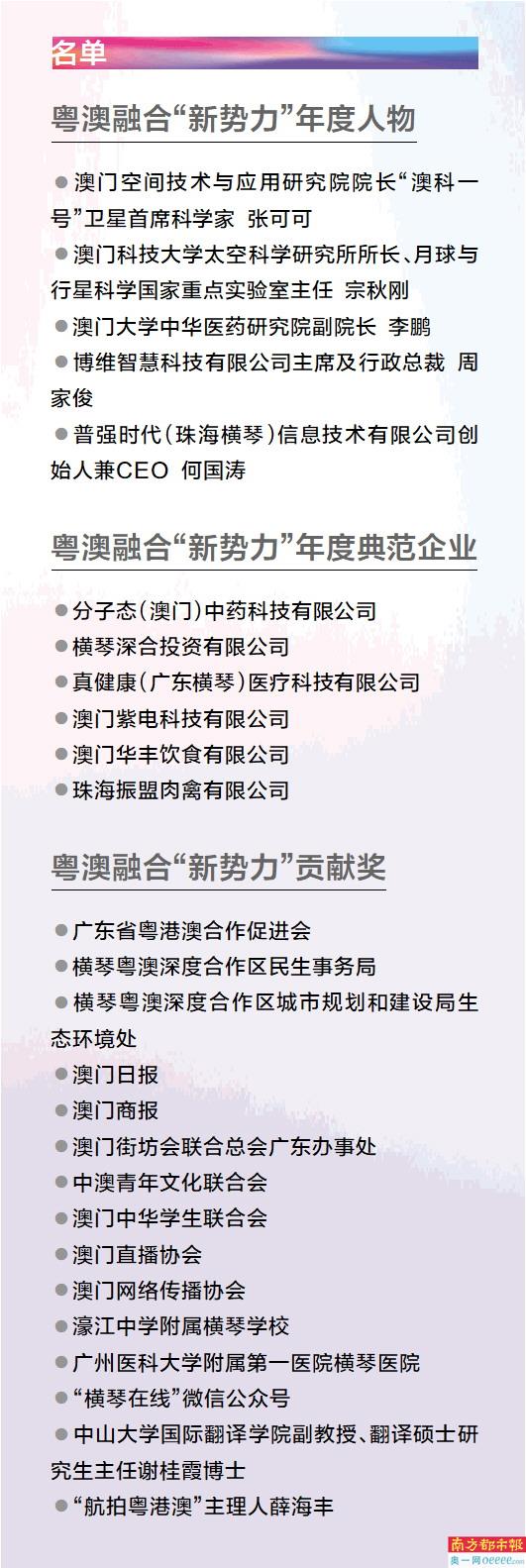 当日,现场颁发N视频粤澳融合“新势力”三项大奖,澳门空间技术与应用研究院院长“澳科一号”卫星首席科学家张可可、博维智慧科技有限公司主席及行政总裁周家俊等5人获得粤澳融合“新势力”年度人物奖;分子态(澳门)中药科技有限公司、横琴深合投资有限公司等6家企业获得粤澳融合“新势力”年度典范企业奖;广东省粤港澳合作促进会、横琴粤澳深度合作区民生事务局等15个机构组织和个人获得粤澳融合“新势力”贡献奖。
