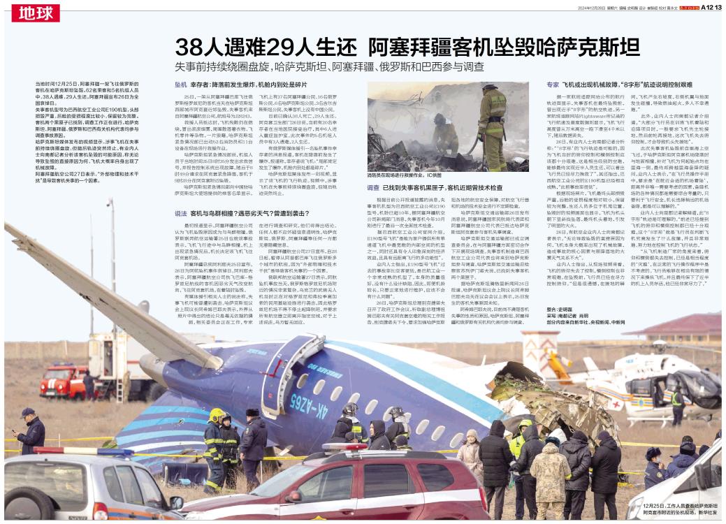 当地时间12月25日,阿塞拜疆一架飞往俄罗斯的客机在哈萨克斯坦坠毁。62名乘客和5名机组人员中,38人遇难,29人生还。阿塞拜疆宣布26日为全国哀悼日。