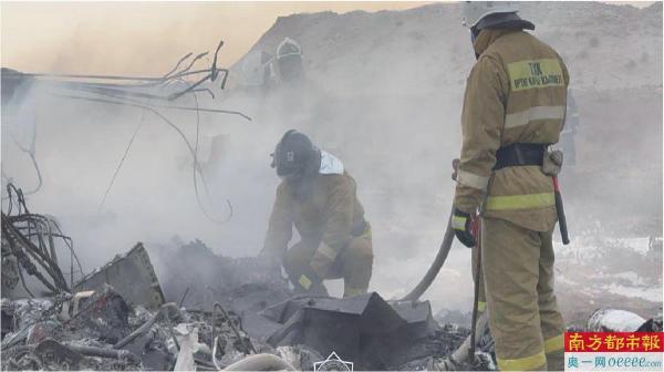 救援人员抵达时,飞机残骸仍在燃烧,冒出滚滚烟雾,周围散落着衣物、飞机零件等杂物,一片狼藉。哈萨克斯坦紧急情况部已出动52名消防员和11台设备在现场进行救援作业。