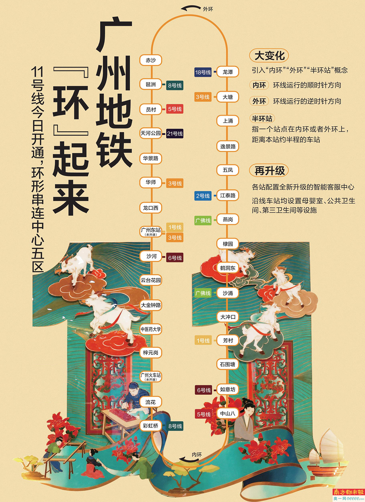 广州地铁11号线芳村站站厅图,芳村站为“粤绣锦华”非遗主题车站,文化图腾采用了“五羊衔五穗”和“广雕窗花”作为主要元素。南都记者 邹卫 摄