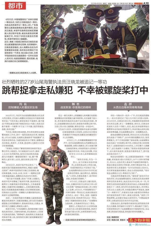 2023年3月24日凌晨,广东汕尾海警局城区工作站的林清平、汪晓龙、陈泳熙、王圣森4名90后执法员,在执行海上查缉走私任务时遭遇暴力抗法。林清平、汪晓龙同几名嫌疑人落入海中。林清平左小腿被快艇螺旋桨打中,血肉模糊,获救后紧急送医,接受截肢手术,年仅27岁的汪晓龙壮烈牺牲。