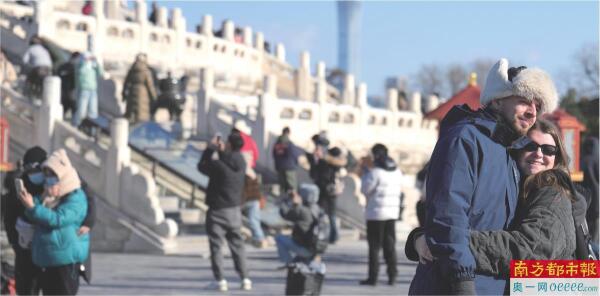 12月5日,两名外国游客在北京天坛公园合影。 新华社发