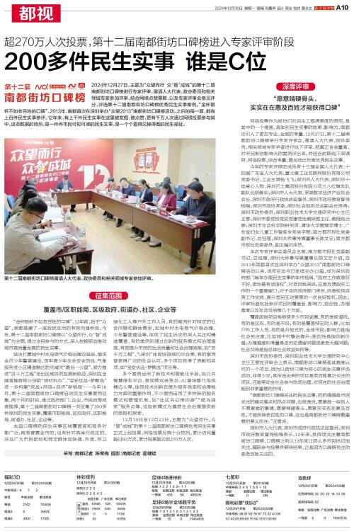 2024年12月27日,主题为“众望而行 众‘智’成城”的第十二届南都街坊口碑榜进行专家评审,邀请人大代表、政协委员和相关领域专家参加评审。