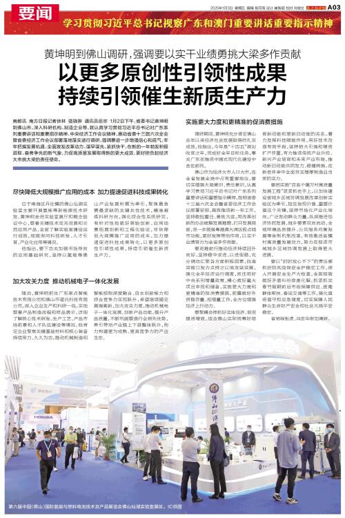 1月2日下午,省委书记黄坤明到佛山市进行调研,强调要进一步增强信心和底气,牢牢把握发展机遇,全面激发改革动力,谋早谋先,紧抓快干。