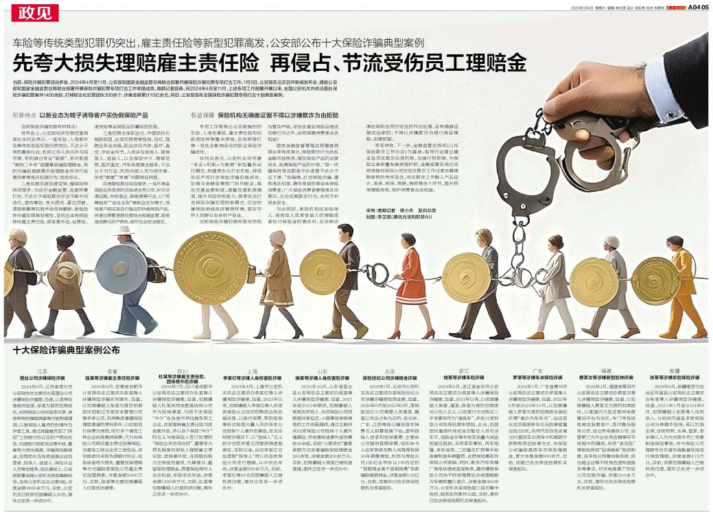 2024年8月,江苏省常州市公安局依法立案侦办某塑业公司涉嫌保险诈骗案。经查,以某寿险推销员陆某、徐某为首的犯罪团伙,利用保险公司间信息共享、承保审核和理赔调查等方面制度漏洞,以被保险人雇员的伤情作为作案工具,通过诱骗雇员签订“阴阳”工伤赔付协议及财产损失收条、伪造银行转款凭证等手段,蓄意夸大损失程度,诈骗保险赔偿金,犯罪团伙及线索涵盖企业经营者、投保人、受益人、保险从业人员等全链条。在此基础上,公安部部署全国公安机关发起集群战役,各地公安机关共立案9起,涉案金额4800余万元。目前,公安机关已抓获犯罪嫌疑人20名,案件正在进一步侦办中。