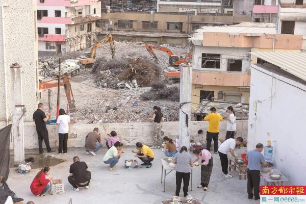 变 2024年,广州城市更新仍在继续。宏观的叙事掌握时代潮流,发生在大街小巷的柴米油盐茶、吃喝拉撒,则构成了宏观叙事下的枝芽和翠叶。图为2024年3月21日,广州市康乐村拆迁片区旁,制衣厂员工们在天台吃饭。
