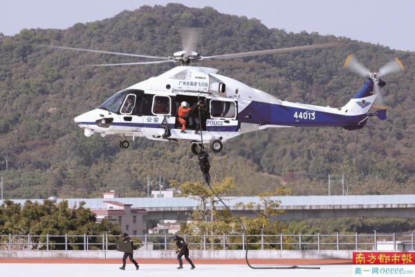 在突击攻坚战术演示环节,特警队员迅速出动,空地一体、密切配合。
