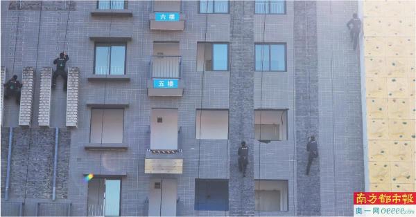 综合攀登索降科目令人叹为观止。队员们在目标建筑内外飞檐走壁,攀爬、索降一气呵成,在极短的用时内稳稳降落地面。