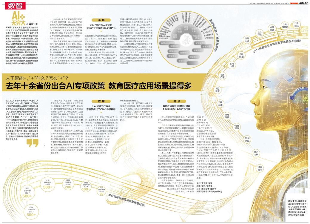 开篇语:为深入贯彻中央经济工作会议对“人工智能+”的战略部署,积极响应省委经济工作会议关于大力实施“人工智能+”行动的要求,南都大数据研究院推出“AI+无穷大”年度专题报道。从政策分析、AI市场规模、人工智能招投标与应用、AI大模型备案情况、2025年AI发展展望等主题切入,通过多维度梳理关键数据,剖析人工智能领域如何在创新驱动下蓬勃发展,赋能千行百业;同时还将聚焦广东,看数字经济第一大省如何在智能医疗、智慧交通、智能制造、AI教育等领域的落地成果。第一期,看已出台人工智能专项政策的省份,如何规划AI+行动应用场景。