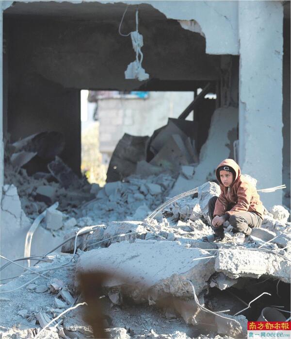 1月3日,在加沙地带,一名巴勒斯坦男孩蹲在遭以军轰炸的废墟上。以色列军队2日袭击包括“人道主义安全区”在内的巴勒斯坦加沙地带多地,造成至少35人死亡。 新华社发